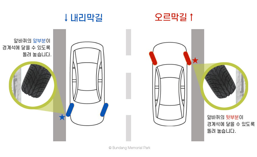 경사로에 정차 또는 주차하시는 경우 고임목(고임돌)이 없다면 아래의 그림과 같이 자동차 앞바퀴가 경계석(★)에 바로 닿을 수 있도록 세워 주시기 바랍니다.