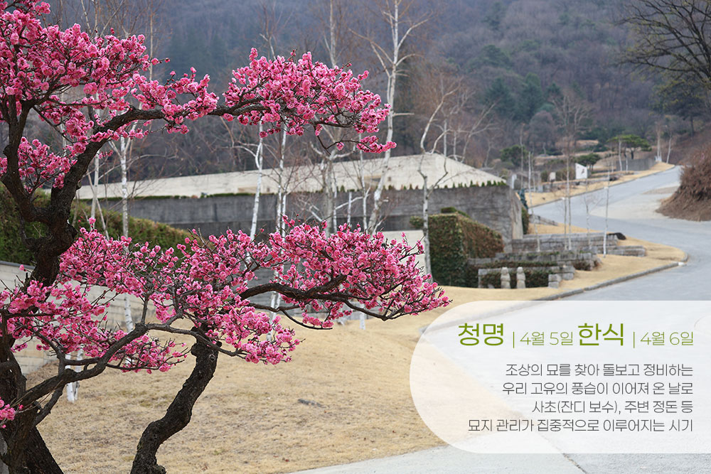 다가오는 청명(4월 5일)과 한식(4월 6일)은 조상을 기리고 묘를 돌보는 전통적인 시기로 많은 분들의 방문이 예상됩니다. 이에 따라 원활하고 안전한 성묘 환경을 위해 산불 예방과 공원이용에 관한 사항을 안내드립니다. ■ 산불 예방 협조 봄철에는 작은 불씨도 대형 산불로 이어질 수 있어 각별한 주의가 필요합니다. 성묘 시 화재 예방에 유의해 주시기 바랍니다.