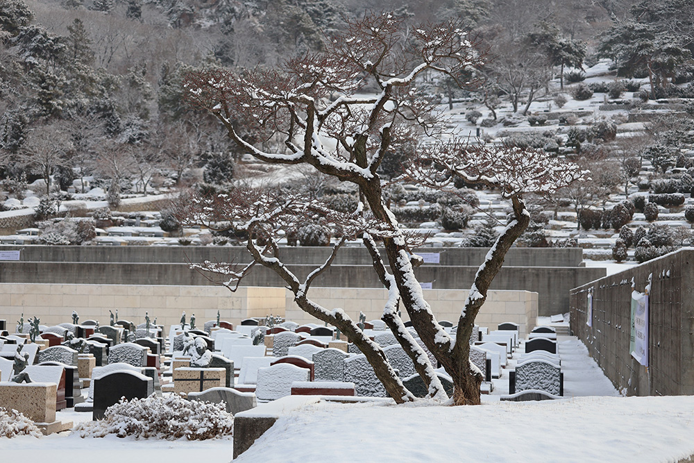 밤사이 조용히 내린 눈이 분당메모리얼파크를 하얗게 감싸안았습니다.