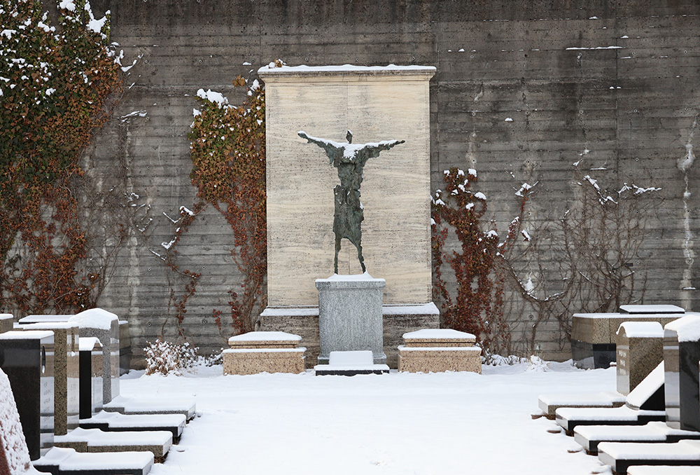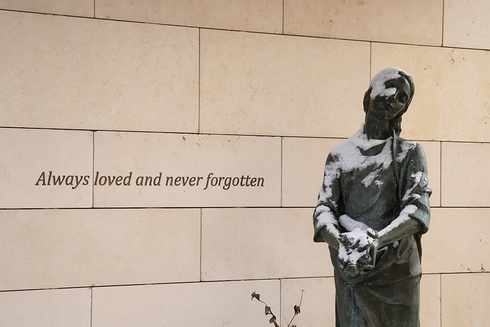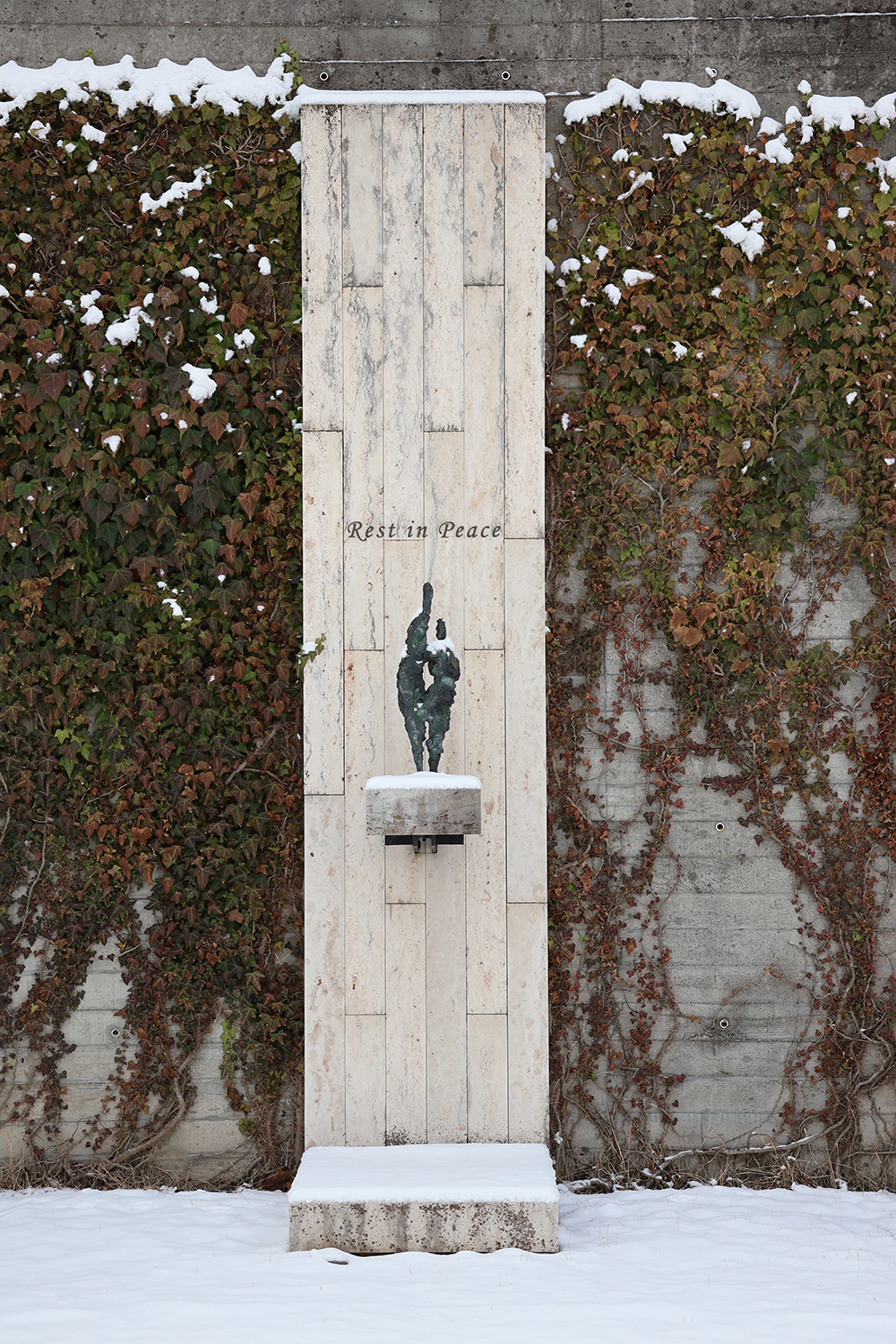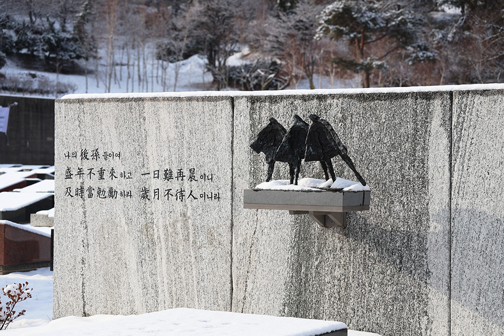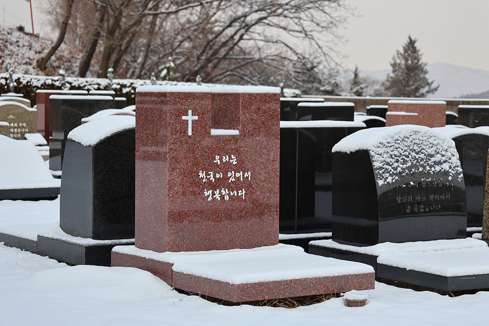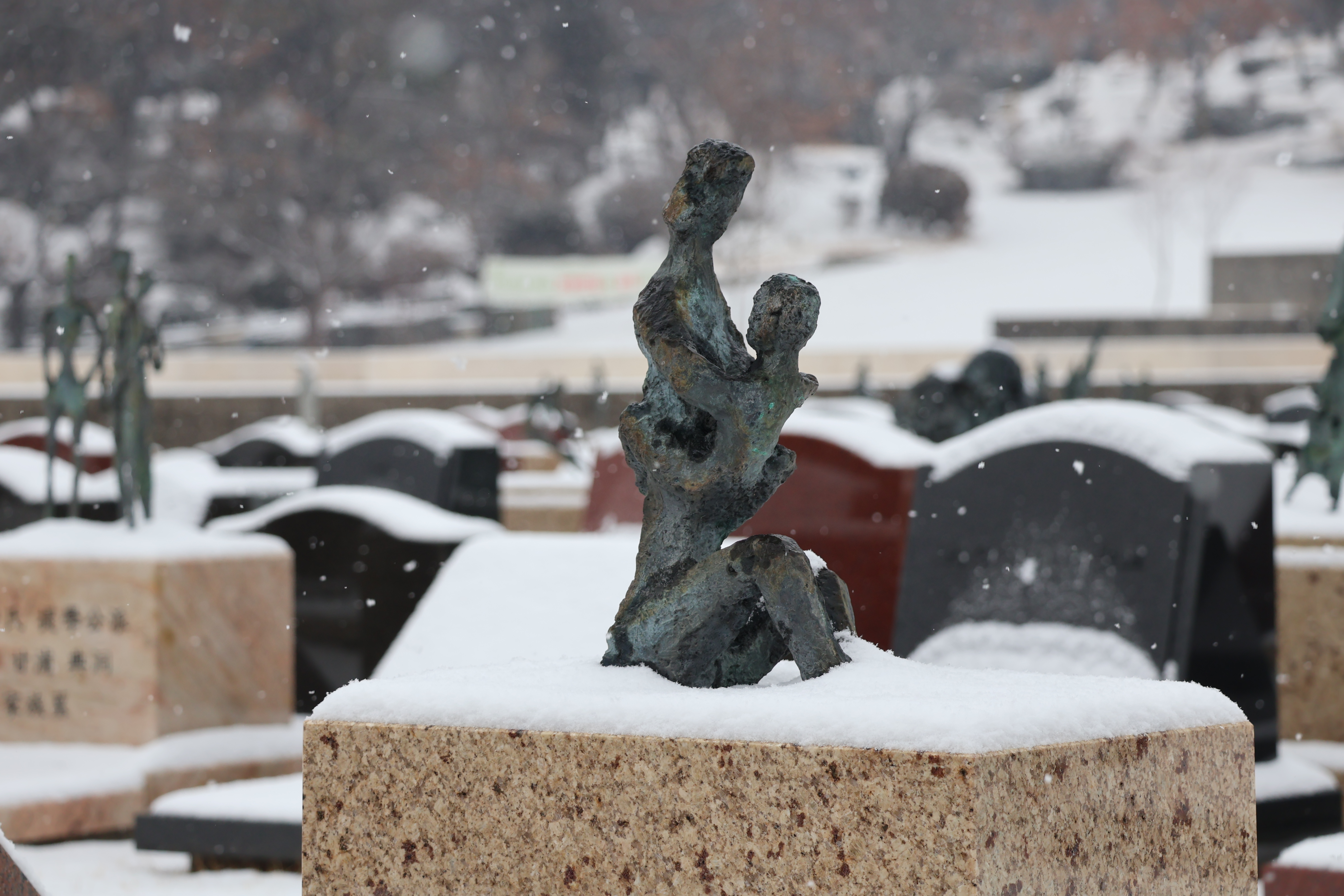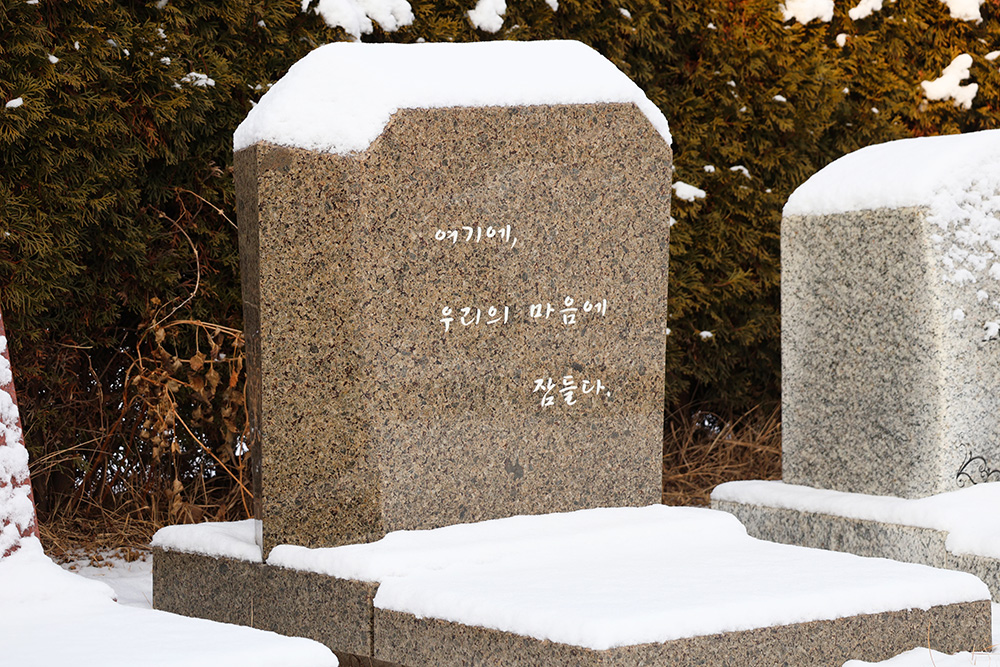 차가운 겨울의 설경 속에서도 이곳은 슬픔만 머무는 공간이 아닙니다. 묘석에 새겨진 묘비문은 삶의 희망과 따뜻한 메시지를 전하고 있습니다.