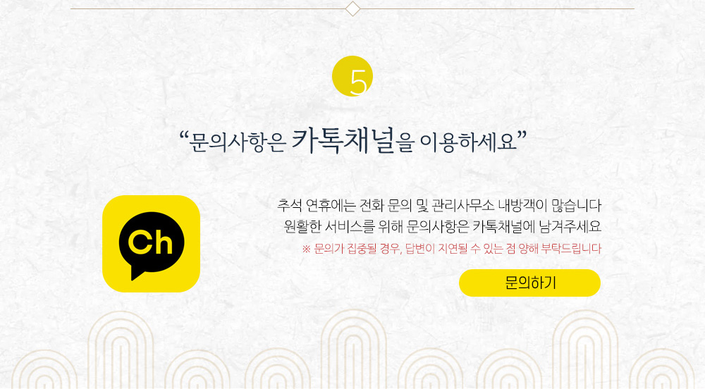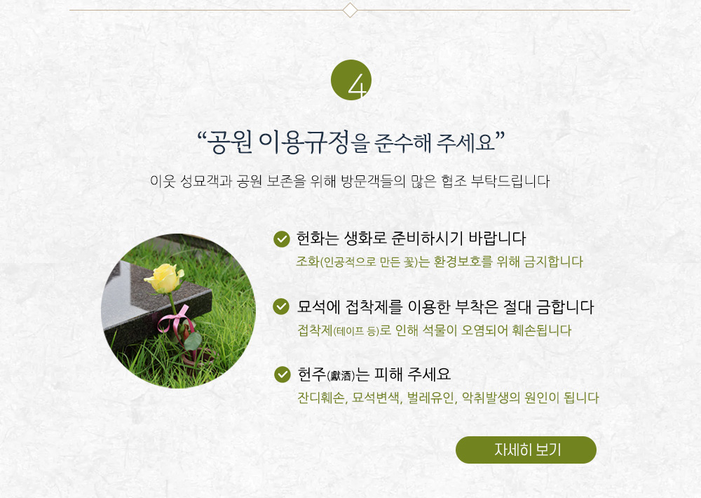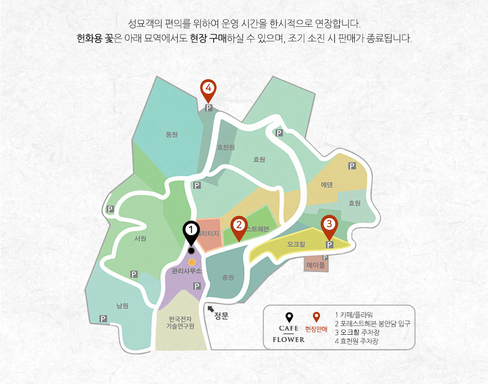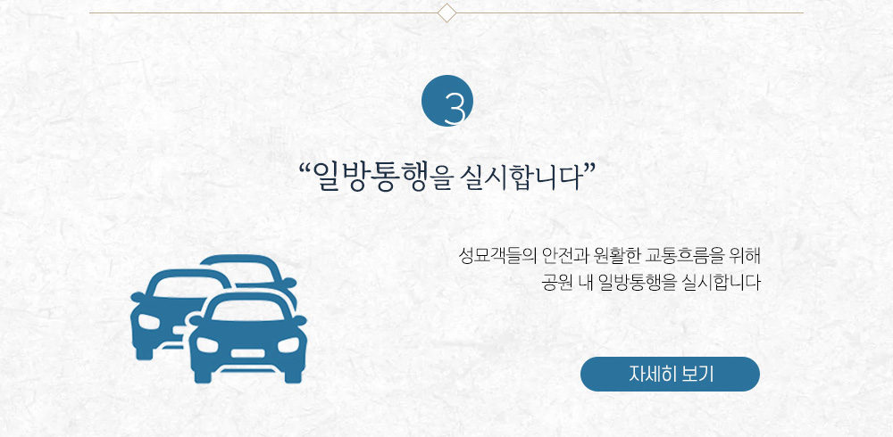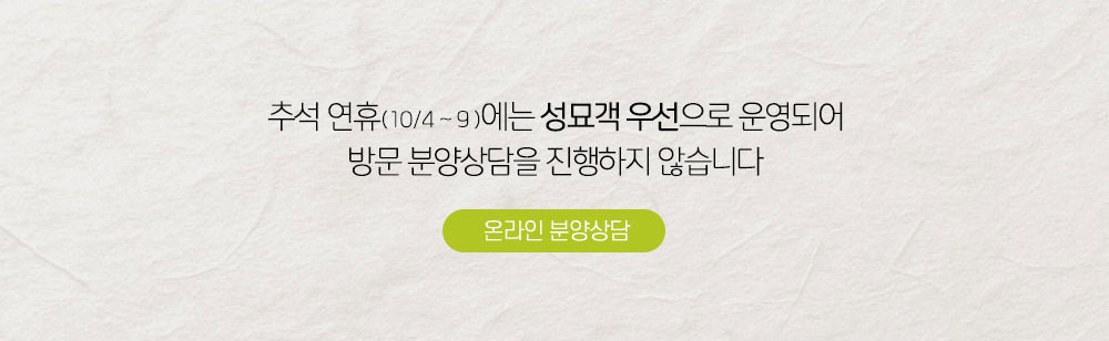 추석을 맞아 공원 방문과 관련하여 안내드립니다. 1 사전성묘를 권장합니다. 2 카페&플라워 연장 운영합니다. 3 일방통행을 실시합니다. 4 공원이용규정을 준수해주세요. 5 문의사항은 카톡채널을 이용하세요. |
