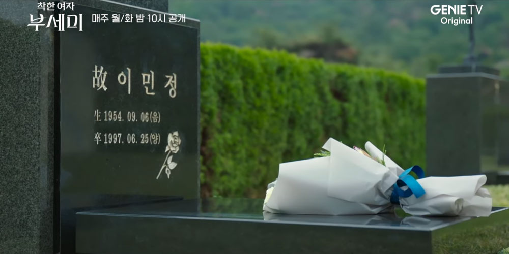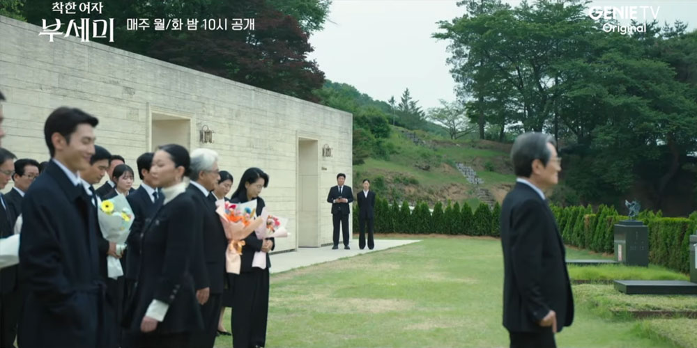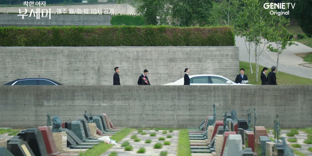 극 중 주인공 김영란/부세미(전여빈)는 재벌 회장 가성호(문성근)의 경호원이 되어 회장 부인의 추모식에 동행하는 장면입니다. 해당 장면은 포레스트헤븐 묘역에 위치한 머제스티 봉안묘에서 촬영되어 첫 회(2025. 9. 29)에 방송되었습니다.