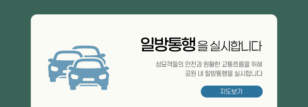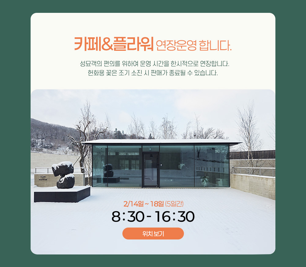 설날을 맞아 공원 방문과 관련하여 안내드립니다. 1 사전성묘를 권장합니다. 2 카페&플라워 연장 운영합니다. 3 일방통행을 실시합니다. 4 공원이용규정을 준수해주세요. 5 문의사항은 카톡채널을 이용하세요.